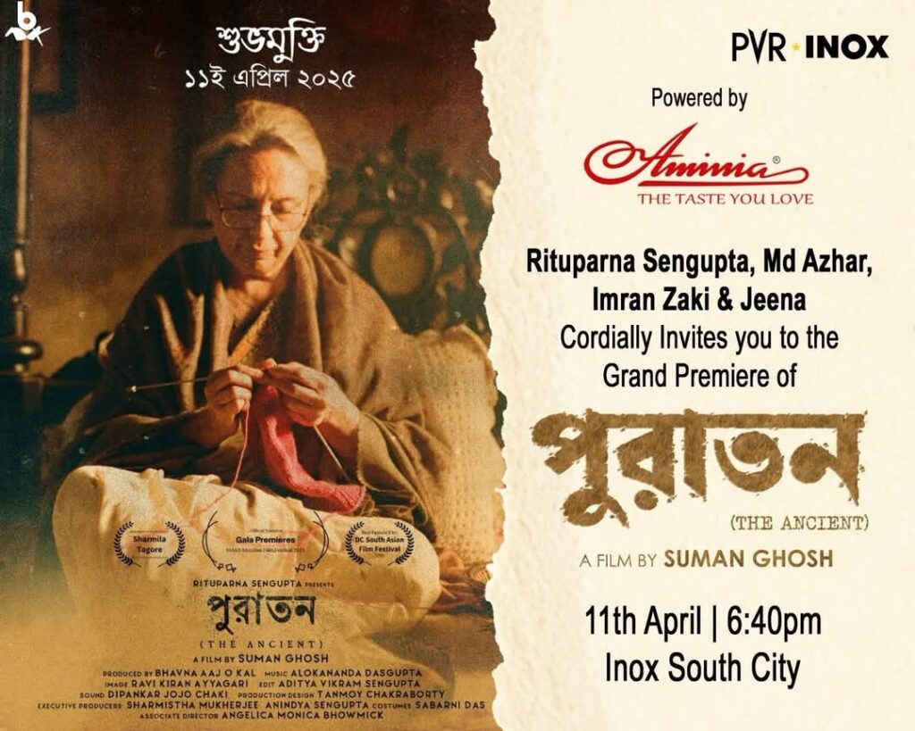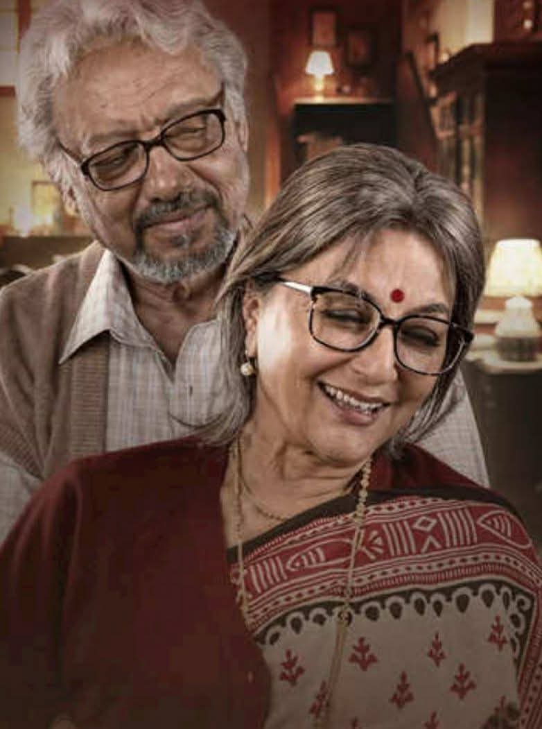 Sharmila Tagore,pivotal in both character and presence, steals the show unequivocally! Pearly skinned with hair to match, the lady lives the role effortlessly. Frozen in time and place, she flits and flirts, putting time to shame with her proud nonchalance of the encroaching ailment. Finely attuned to the script at hand, her gesticulations with her finely veined magnolia  hands remain an artist’s delight. Certainly the star of yesteryears makes a sweeping statement with ‘PURATON’, ensuring that she transcends TIME, to remain TIMELESS…